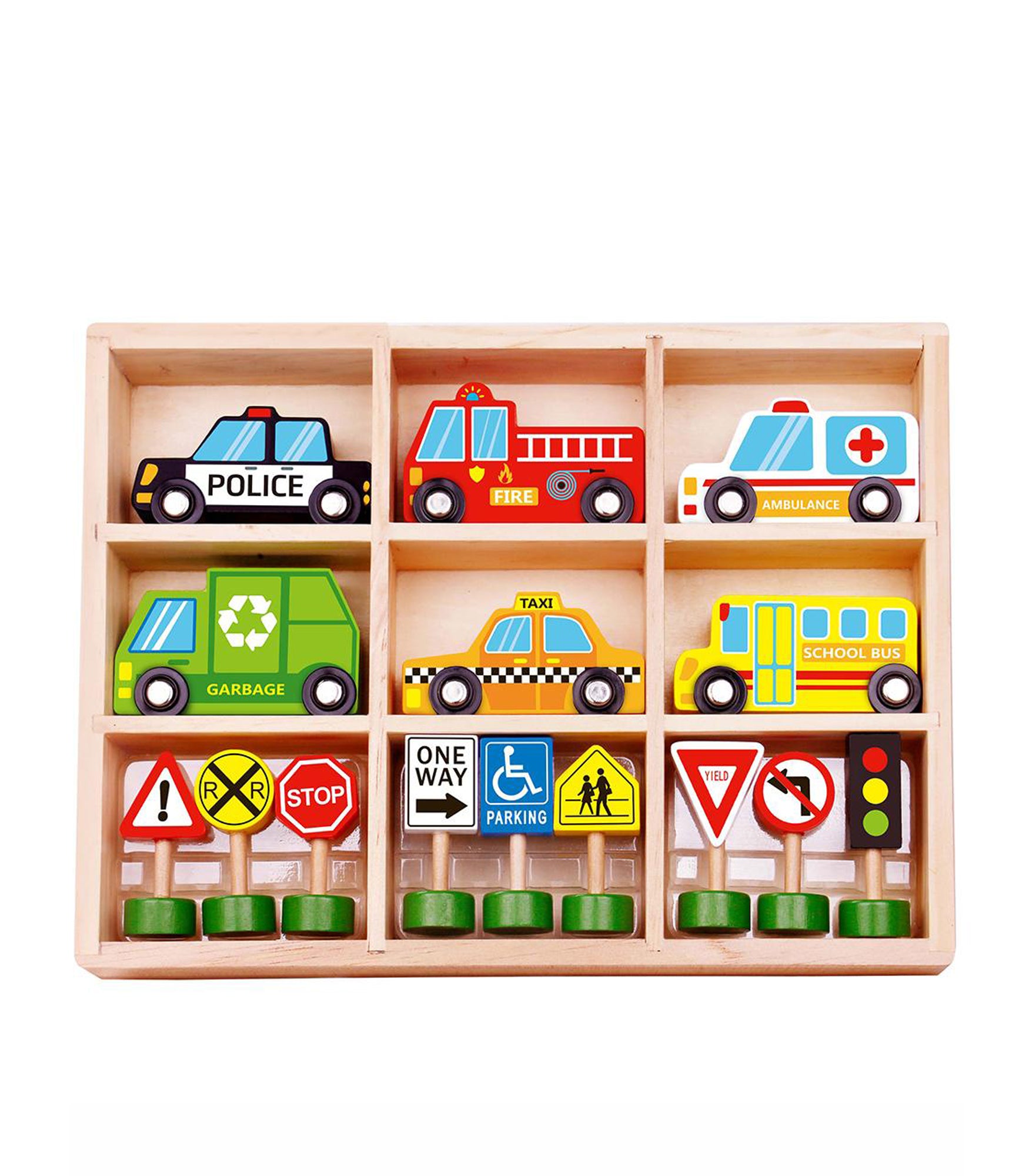 The Transportation and Wooden Street Sign set is an awesome set of six little wooden vehicles and nine wooden toy road signs (6.5cm high) compartmentalised in a wooden tray box.